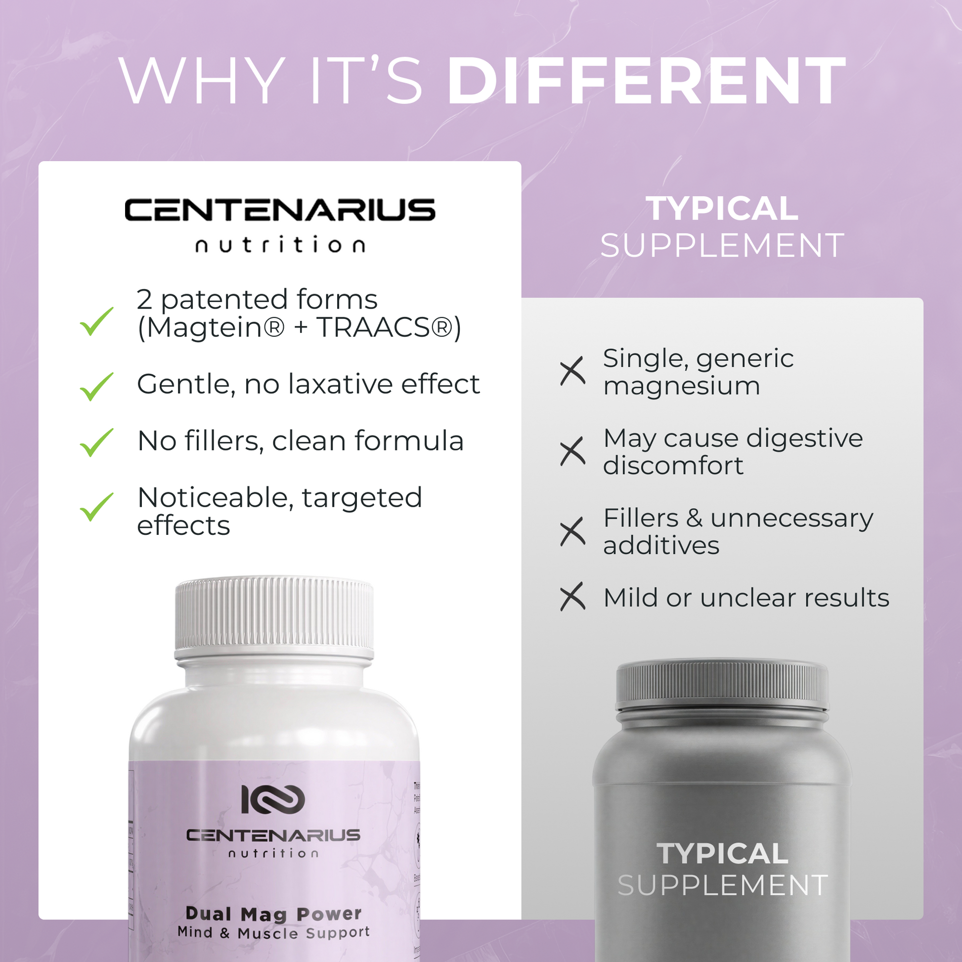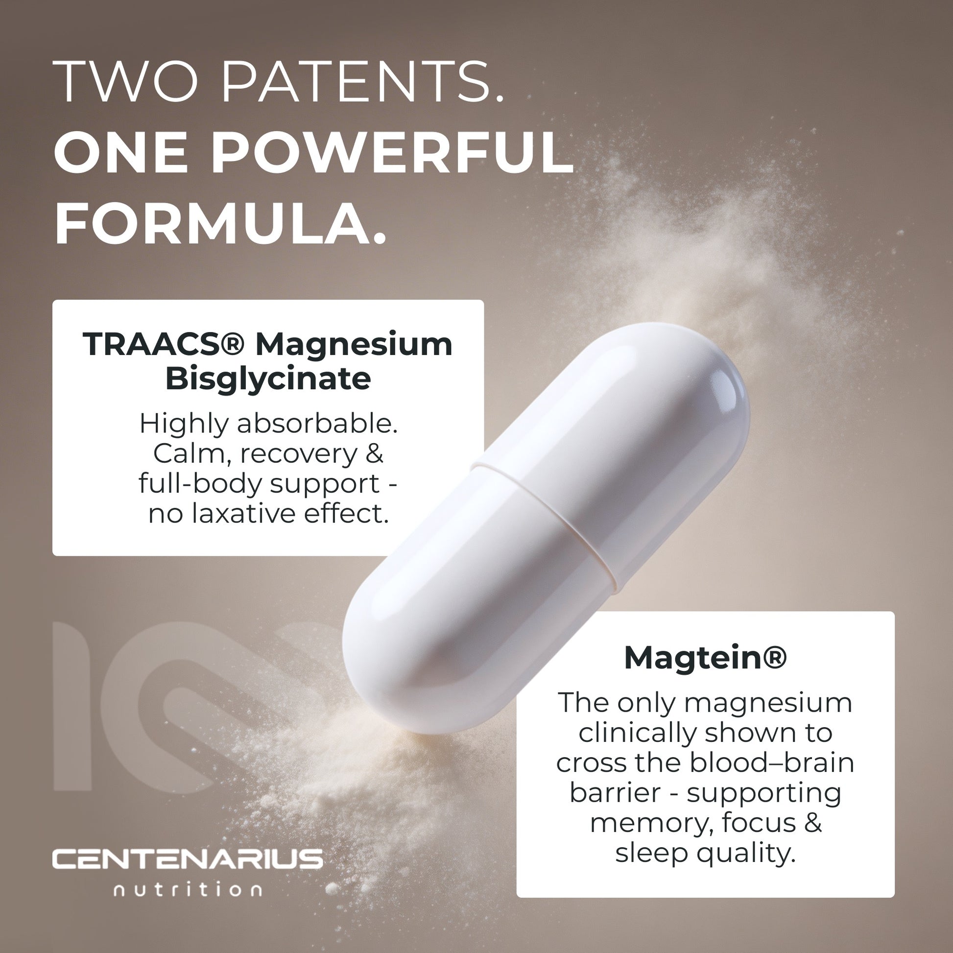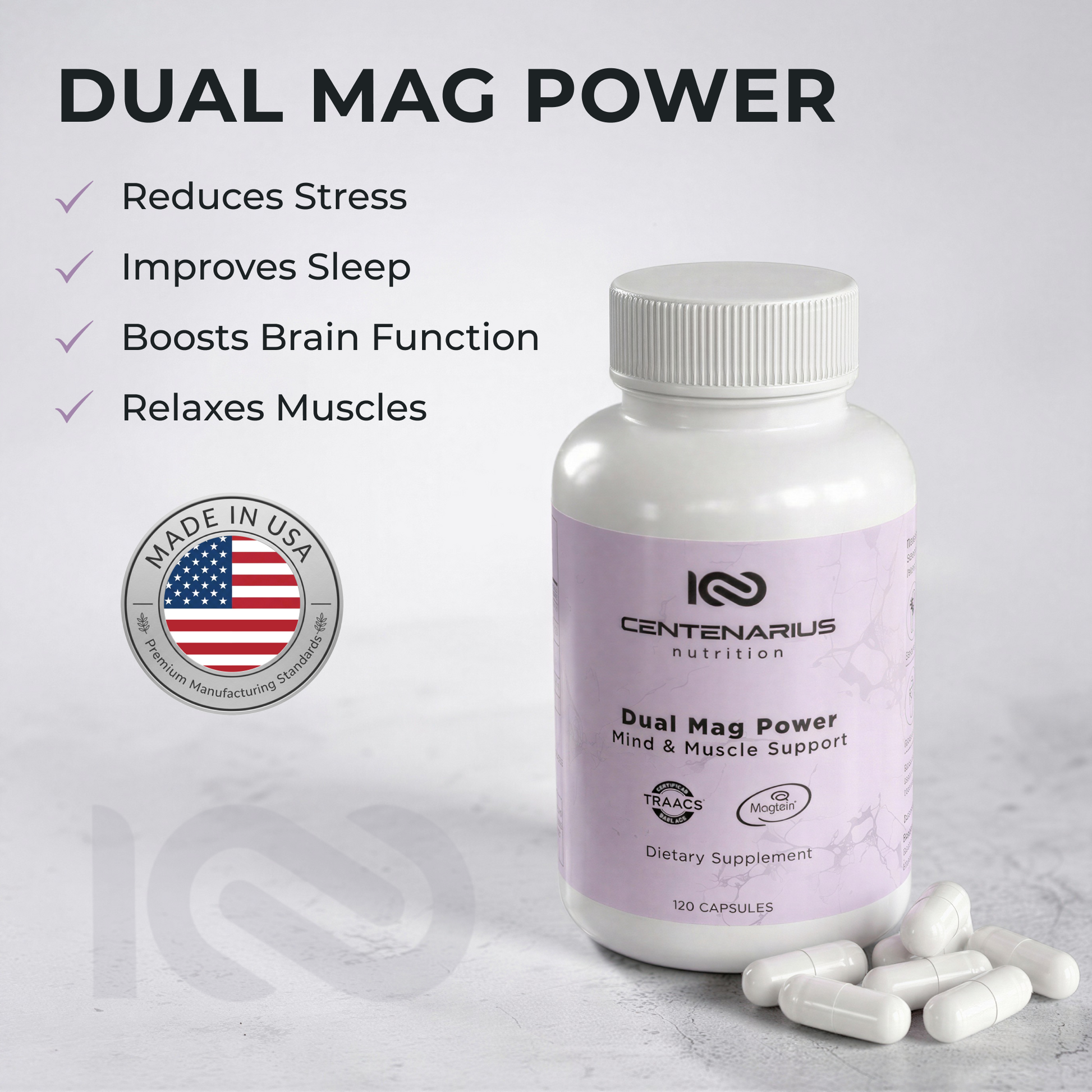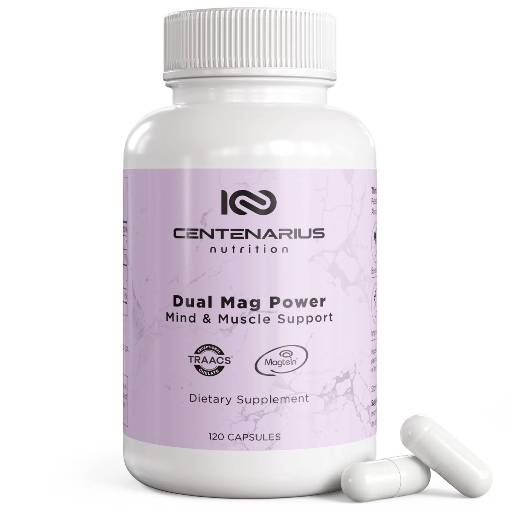 Two patented magnesiums for brain, body & better sleep. Dual Mag Power pairs Magtein® (magnesium L-threonate) for cognitive performance with TRAACS® magnesium bisglycinate chelate for calm muscles and steady nerves.