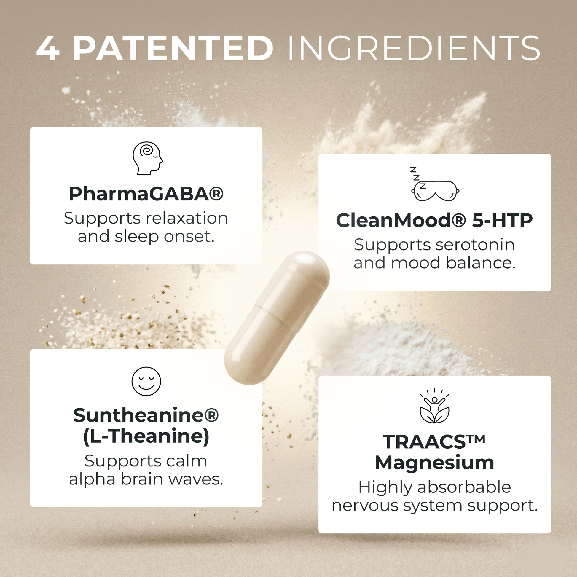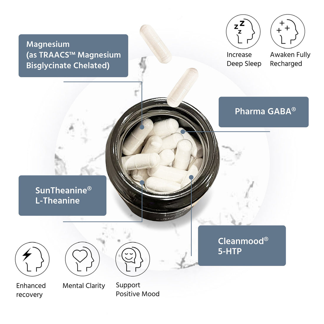 It combines natural ingredients like SunTheanine®, PharmaGABA®, and CLEANMOOD™ 5-HTP to promote deep, restful sleep, reduce stress, and enhance mood without forming habits. Each ingredient is carefully selected for its ability to calm the mind, relax the body, and support a healthy sleep cycle.