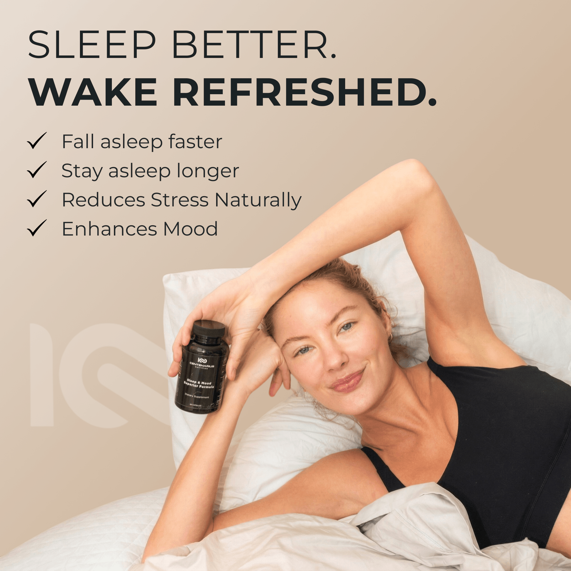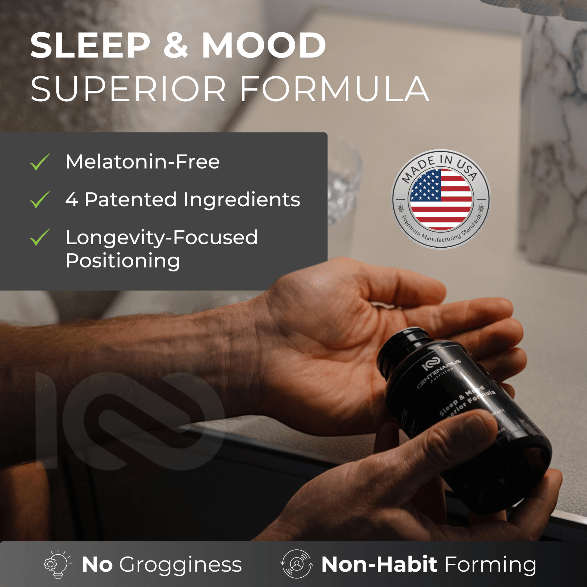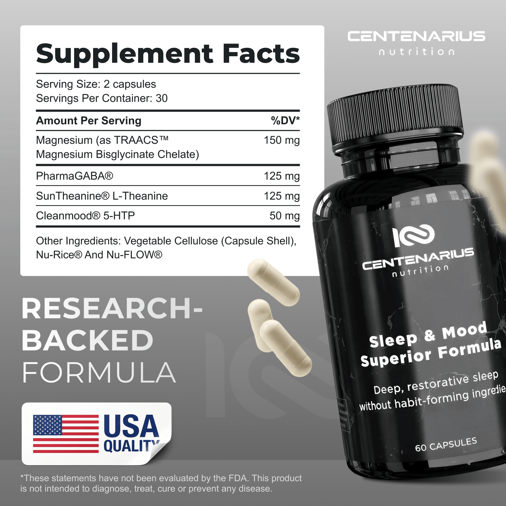 Your best life starts with better sleep. Centenarius Sleep & Mood Superior Formula is crafted to help you fall asleep faster, stay asleep longer, and wake up fully refreshed, without the use of habit-forming ingredients. Our proprietary blend combines the award-winning Suntheanine®, natural PharmaGABA, TRAACS™ Magnesium Bisglycinate Chelate, and CLEANMOOD™ 5-HTP to reduce stress, help mental clarity, enhance your mood, and promote deep, restorative sleep.