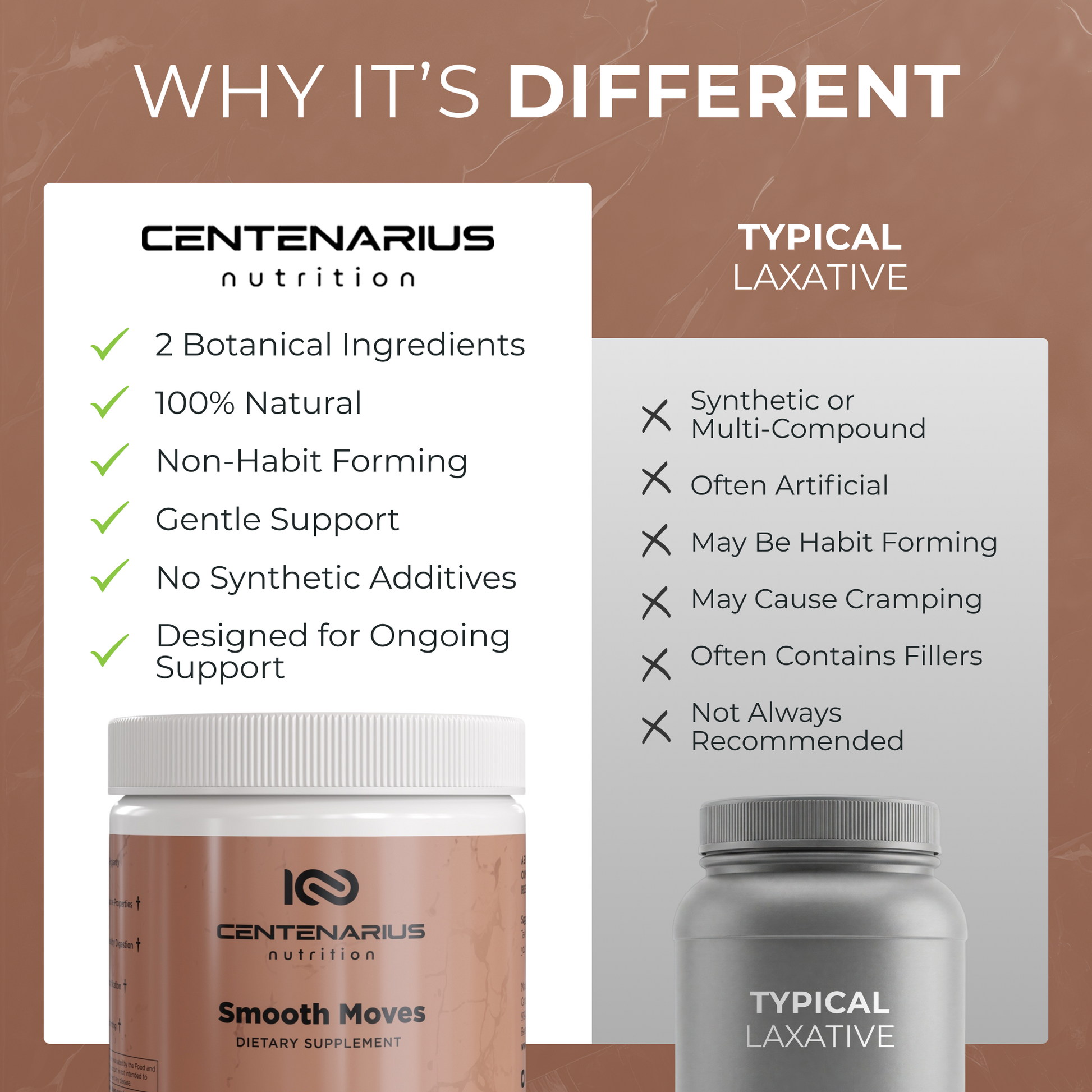 Unlike synthetic laxatives that can be harsh on your system, Smooth Moves uses nature's remedies to promote regularity and support your body’s natural rhythms. With Cascara Sagrada stimulating intestinal movement and Aloe Ferox soothing the digestive tract, this formula provides gentle, consistent support without disrupting your system.